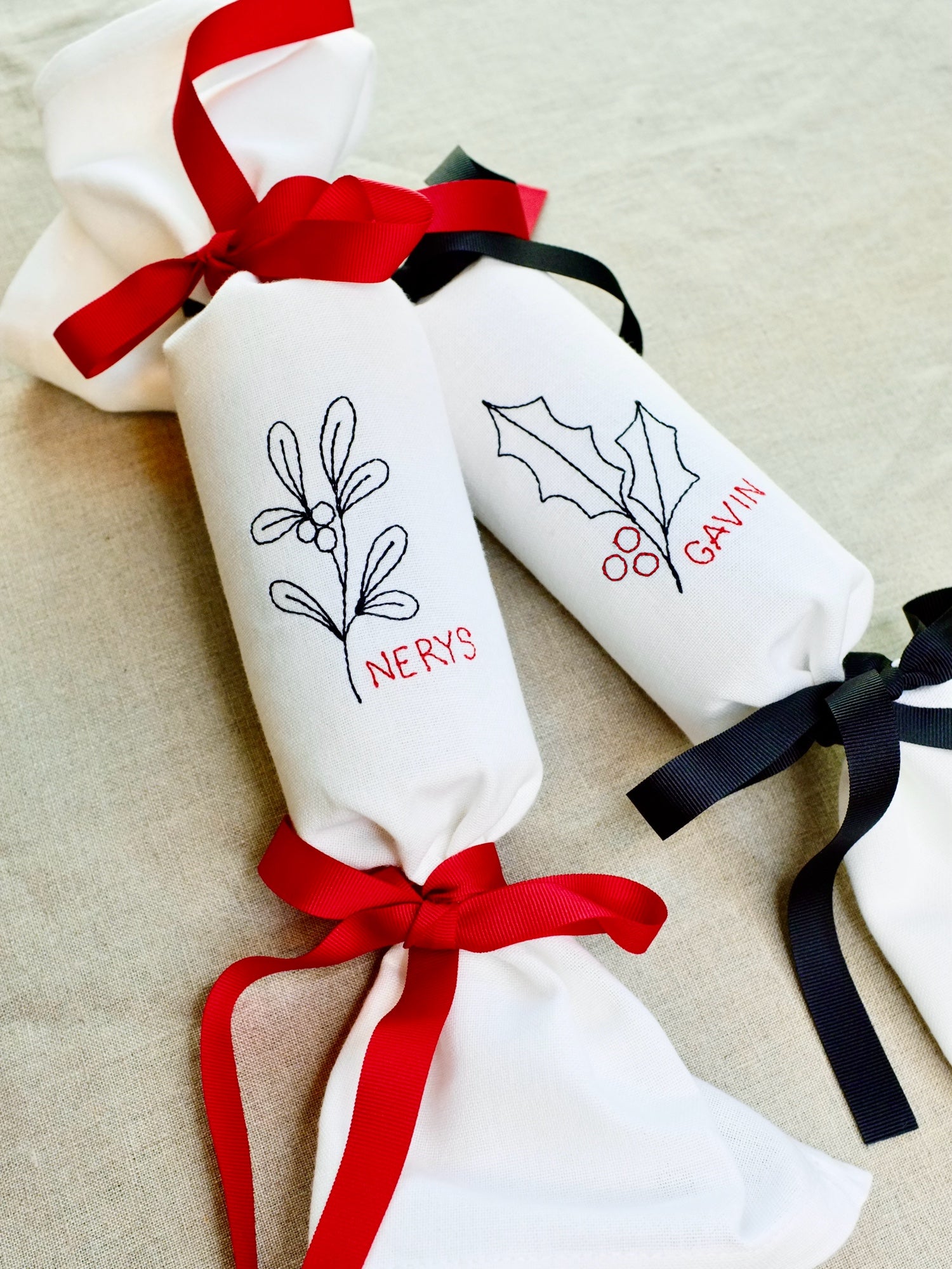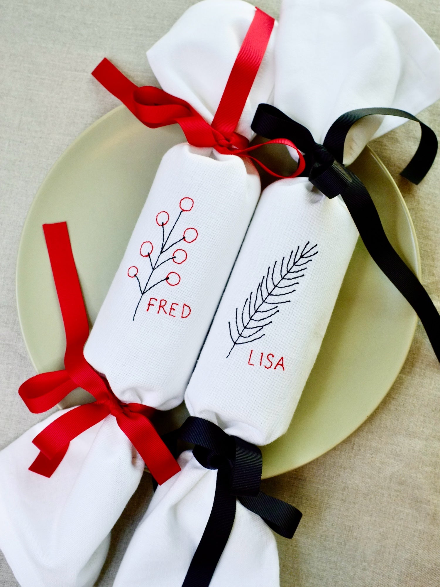 Personalised Christmas crackers napkins with four mix-and-match designs - berry, fir, holly, and mistletoe - embroidered in crisp block print (up to 20 characters). Finished with your choice of black or red grosgrain ribbon, plus an empty gift box ready for you to fill with treats. Perfect for Christmas Day, then use as napkins all year round.