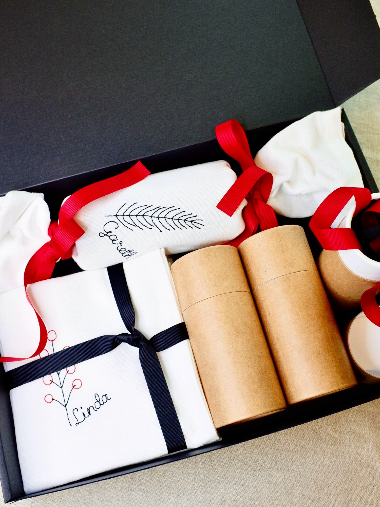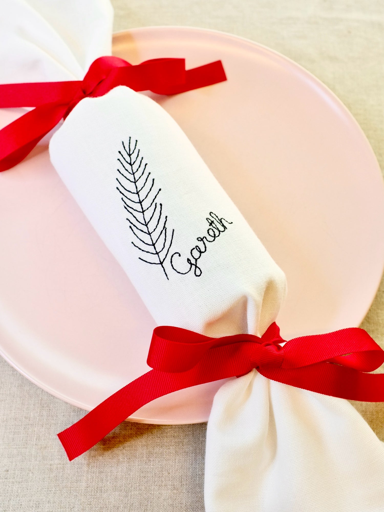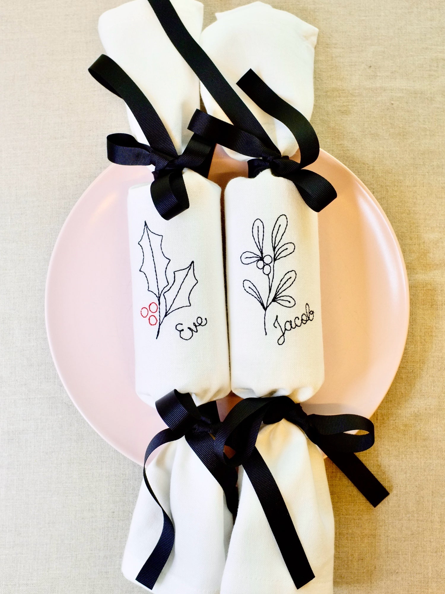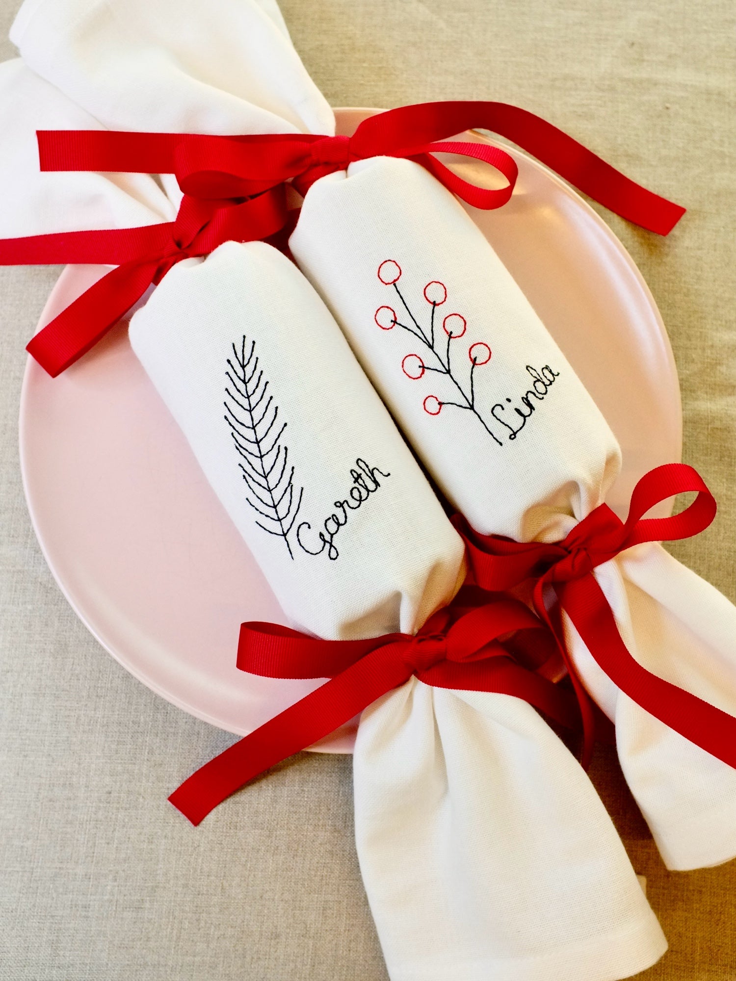 Personalised Christmas cracker napkins with four mix-and-match designs - berry, fir, holly, and mistletoe - embroidered in my cursive text (up to 20 characters). Finished with your choice of black or red grosgrain ribbon, and an empty gift box to fill with your treats. Perfect for Christmas Day, then use as napkins all year round.