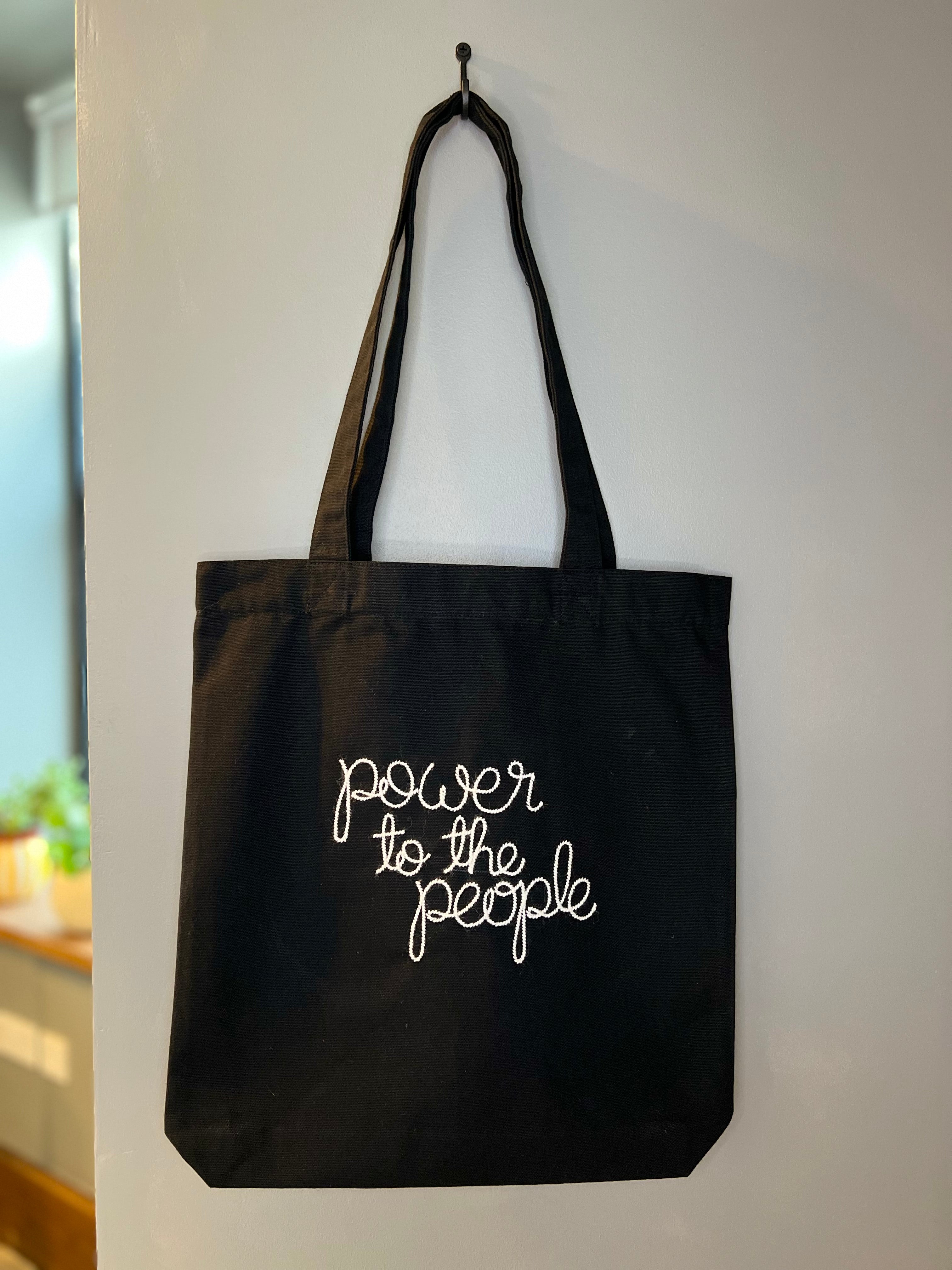 A sturdy, woven canvas tote bag (80% recycled cotton, 20% recycled polyester) embroidered in my cursive script with the message 'power to the people'.
