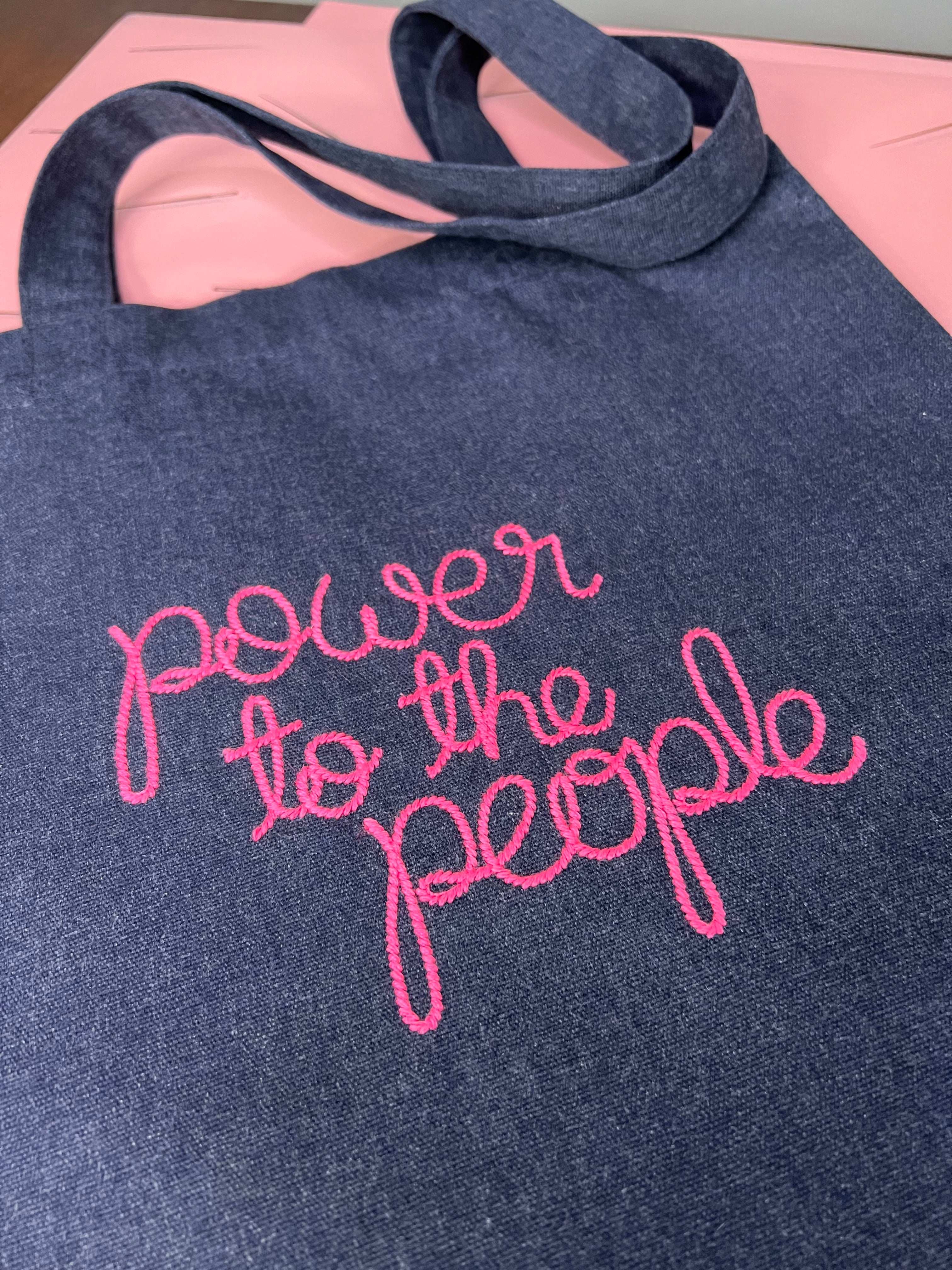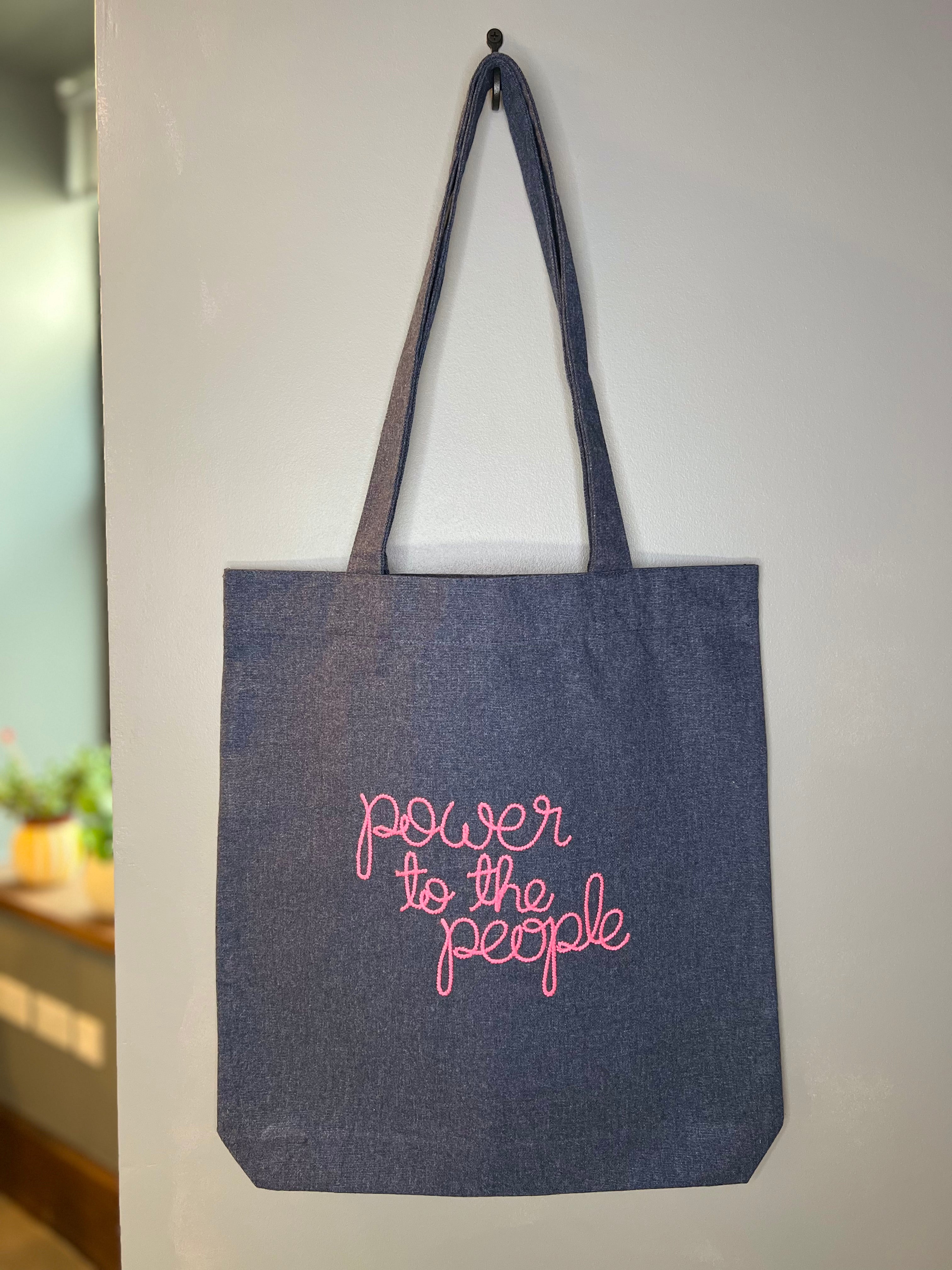 A sturdy, woven canvas tote bag (80% recycled cotton, 20% recycled polyester) embroidered in my cursive script with the message 'power to the people'.